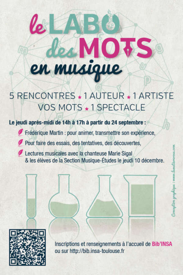 Conçu comme un moyen de partage, le laboratoire se fonde sur l’interdisciplinarité artistique et débouchera sur une lecture spectacle collective en partenariat avec la section musique de l’Insa, sous la houlette de la chanteuse-compositrice Marie Sigal. Lire ses textes à haute voix, dans un contexte de création collective, c’est aller au bout de l’expérience : on donne et on reçoit.